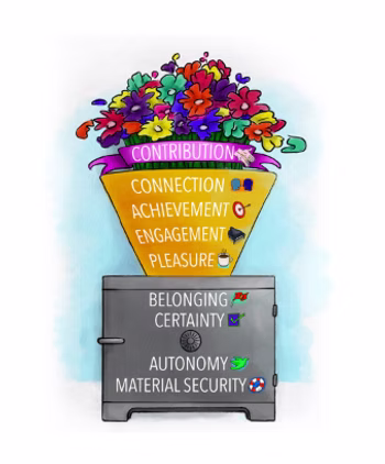Contribution - giving your energy, effort, care, time, skill &/or resources to help other beings - human or otherwise. This is often where we find meaning, and it has a great purchase on our happiness.